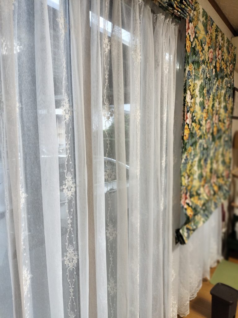 大きな掃き出し窓に合わせて、2枚に分けて仕立てることで、