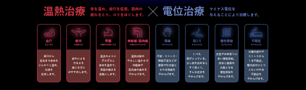 エアーヘルシオンは、温熱治療と電位治療で8つの症状をやわらげてくれる敷きふとんです。