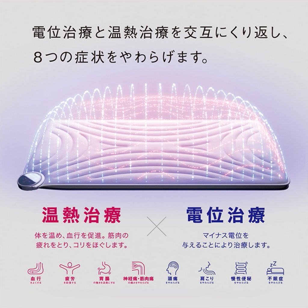身体を温めて血行を促進する「温熱治療」と、負電位をかけて頭痛や肩こり、不眠症などを緩和する「電位治療」の2つの機能を備えています。
