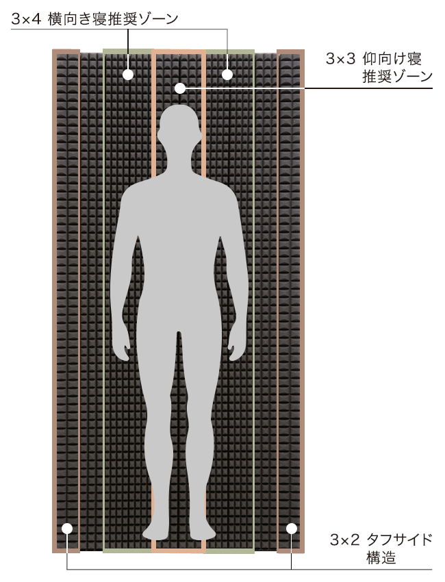 点で支える独特な凹凸構造が体圧を分散しつつ、自然な寝姿勢を保持。仰向け、