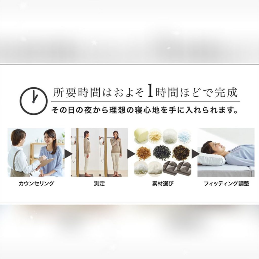 注文も複雑に見えがちな、オーダーまくらですが、実はカウンセリングからフィッティング調整までおおよそ1時間ほどなんです!